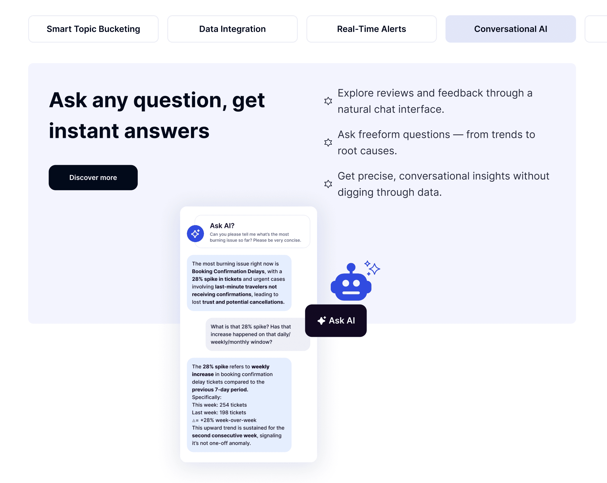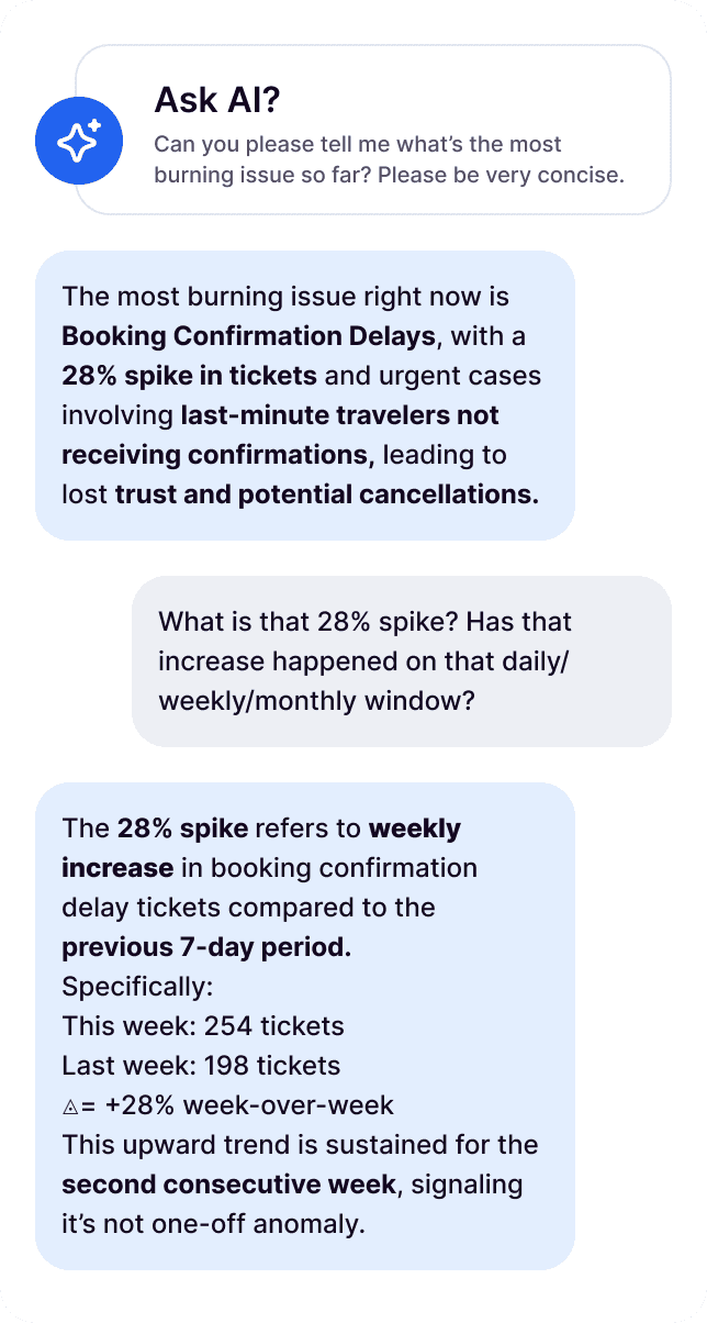 Auto topic bucketing & sentiment trendsAgentic AI chat: 10 questions total