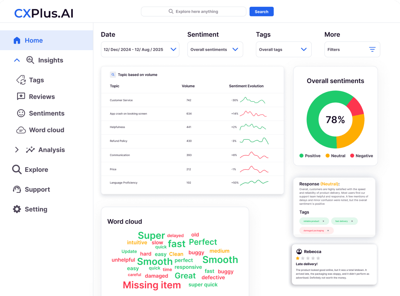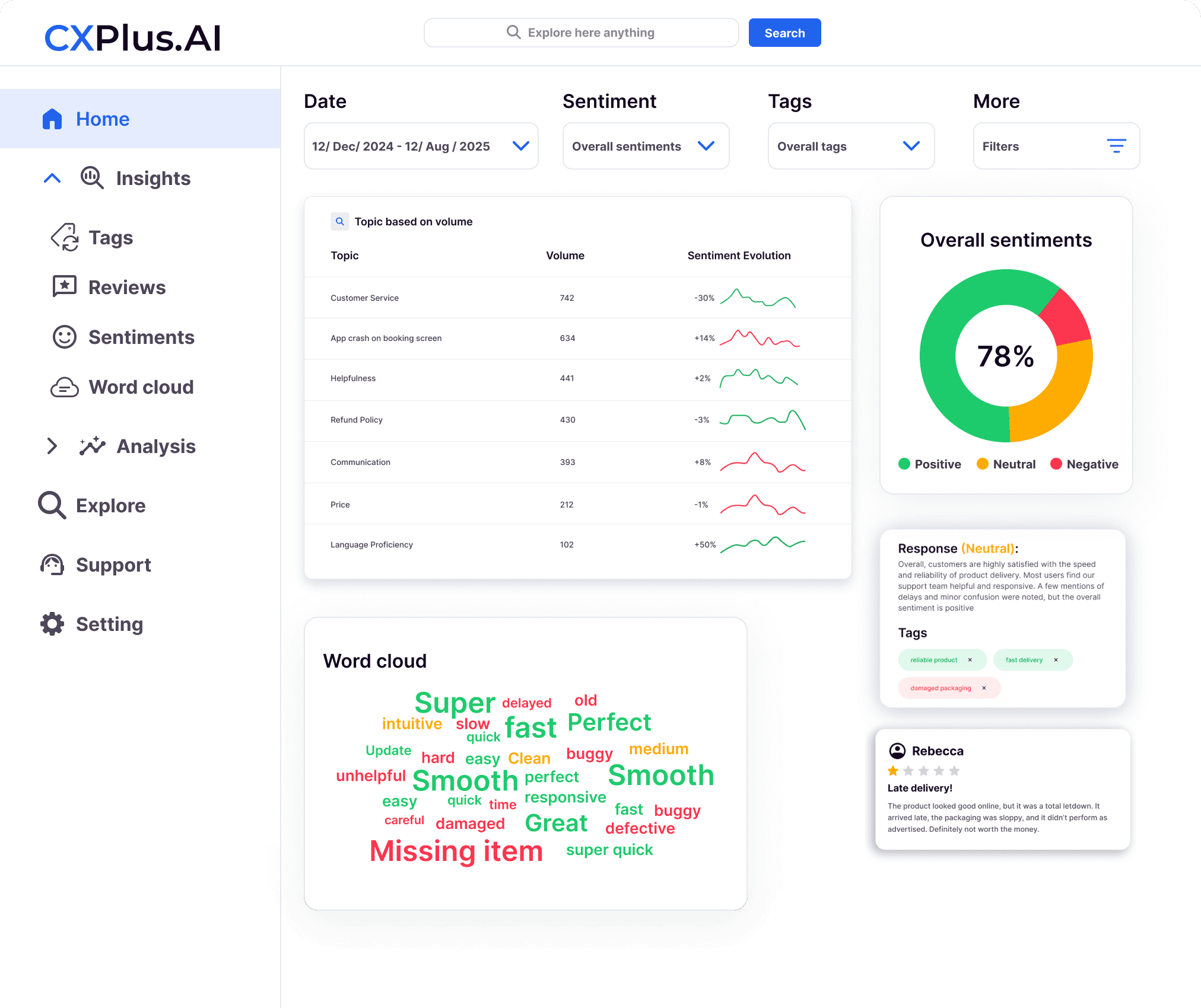 From scattered feedback to clear direction cxPlus gives product managers, CX leads, and executives the clarity they need to spot trends, monitor competitors, and make smarter decisions.